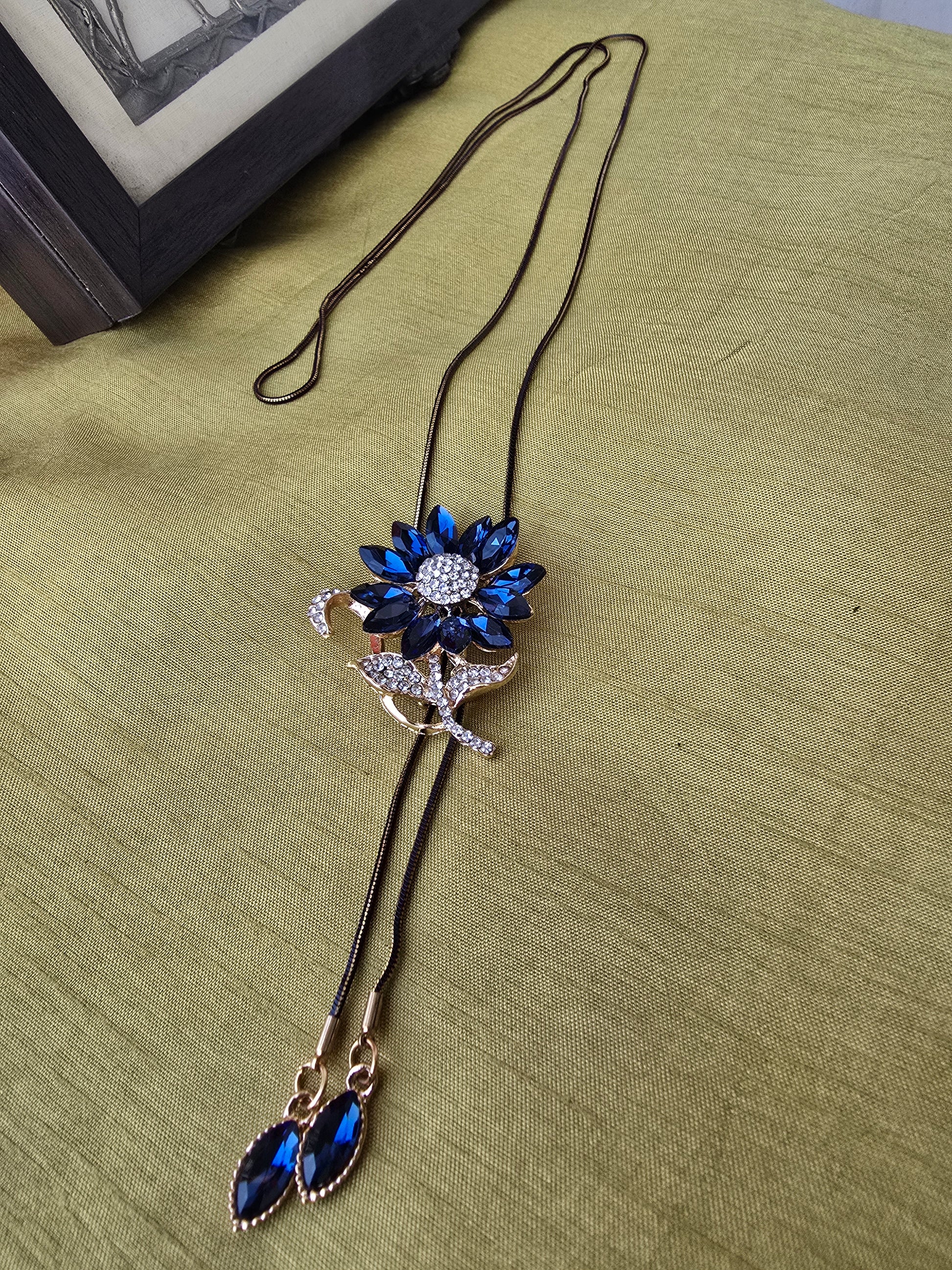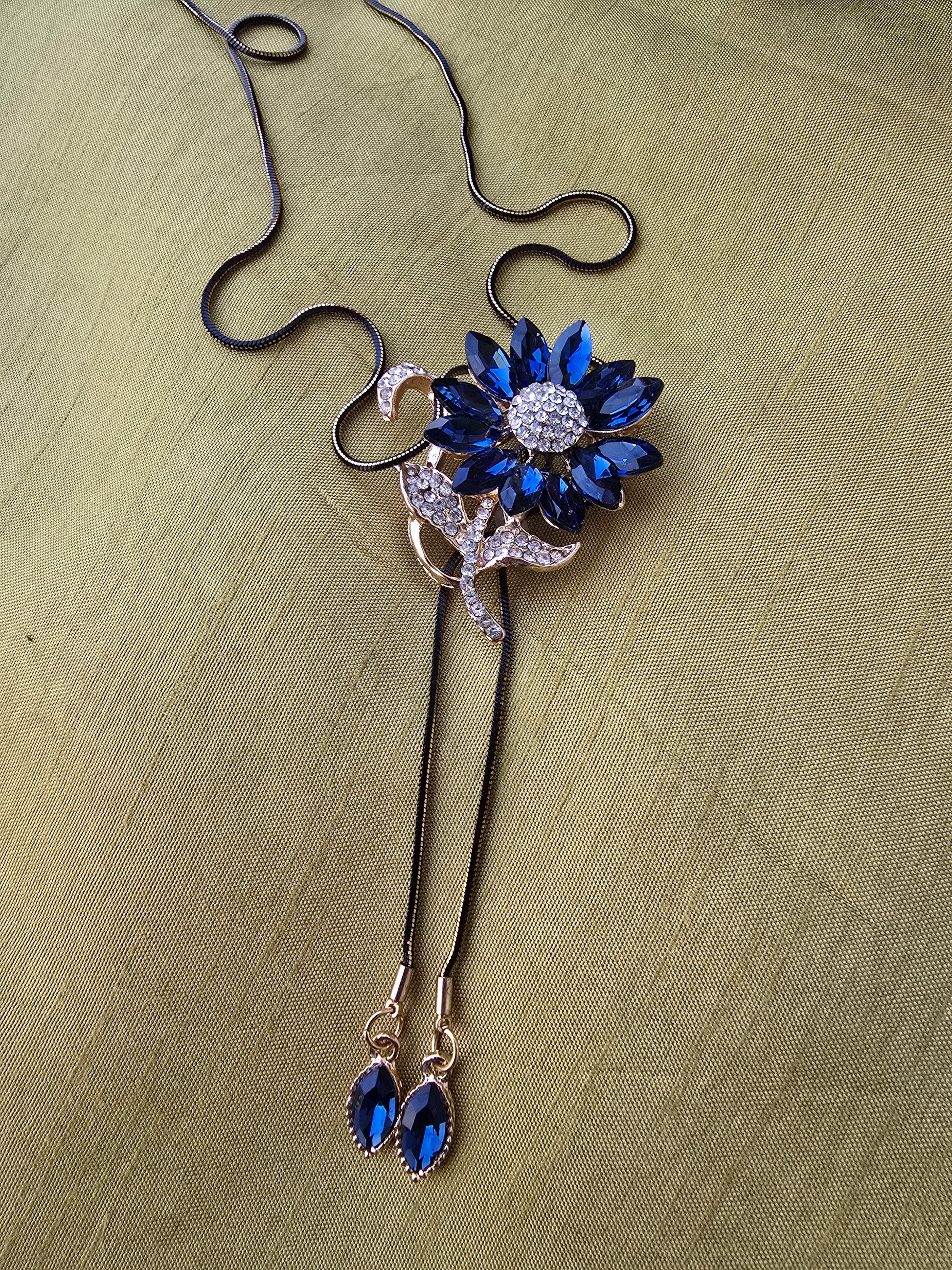 This stylish necklace features a stunning lariat design with a crystal flower pendant in royal blue. The black chain is accented with blue and white rhinestones for added elegance. Perfect for adding a pop of color to any outfit.