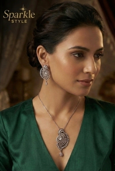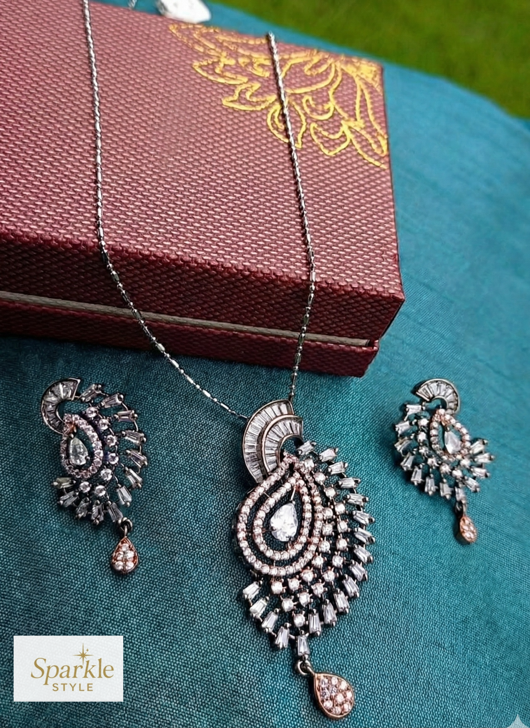 This two tone AD set features a beautiful combination of rose gold and black rhodium polish, giving it a unique and elegant appearance. The teardrop design is embedded with high-quality cubic zirconia diamonds, making it a stunning and sophisticated accessory. Elevate your style with this exquisite set.